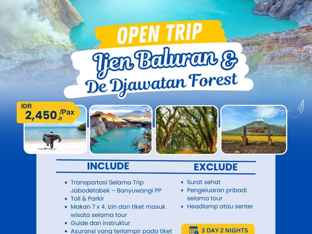 Open Trip Ijen Baluran dan De Djawatan Forest dengan durasi 3 days 2 night seharga 2.450.000/pax, keberangkatan tanggal 5-8 Desember 2025.